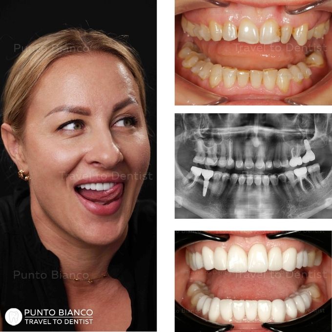 Pacienta, originară din România și stabilită în Canada, a ales să vină în Moldova la recomandarea unui cuplu mulțumit de rezultatele obținute la Punto Bianco. La momentul prezentării în clinică, situația dentară era una complexă: purta o lucrare veche din metaloceramică, deteriorată și inestetică, iar dinții restanți erau afectați de boală parodontală, prezentând mobilitate. În plus, la nivelul maxilarului superior se constata o atrofie osoasă severă, ceea ce complica semnificativ opțiunile de tratament.